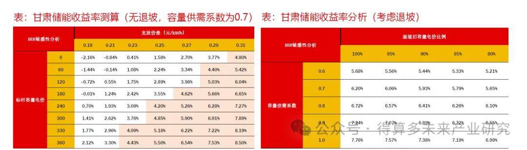 ➢ 测算来看,假设容量若容量供需系数为0.7,若电价维持10年、两年后不退坡,仅靠现货市场套利全投资收益率为2.7%左右,叠加容量电价,全投资收益率提升至6.22%,考虑甘肃调频辅助服务收益,贷款投资收益率预计更高。