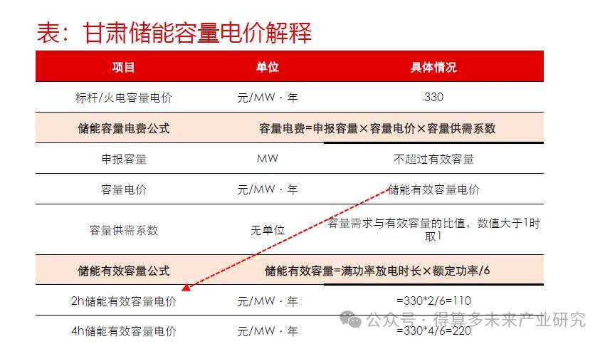 ➢ 容量电价:甘肃储能容量电价计费方式为:容量电费=申报容量×容量电价×容量供需系数;其中申报容量不超过有效容量,储能有效容量=满功率放电时长×额定功率/6;其中容量功率系数为容量需求与有效容量的比值,数值大于1时取1。