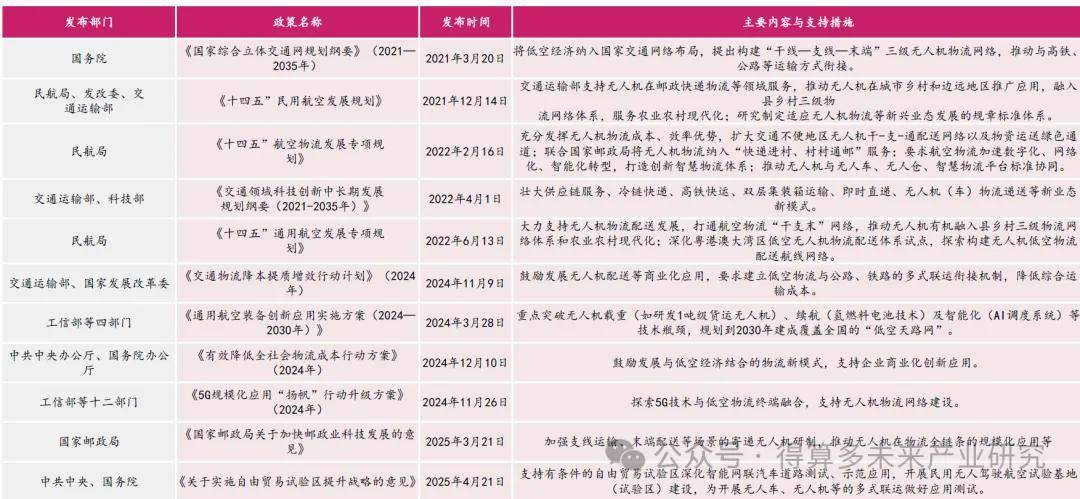 • 而以无人机作为载体的低空物流是整个无人物流体系建设的重要一环,我国推出一系列政策鼓励发展低空物流,重点从技术研发、基础设施建设、应用场景开拓、运营补贴、空域管理五个方向给予政策支持。