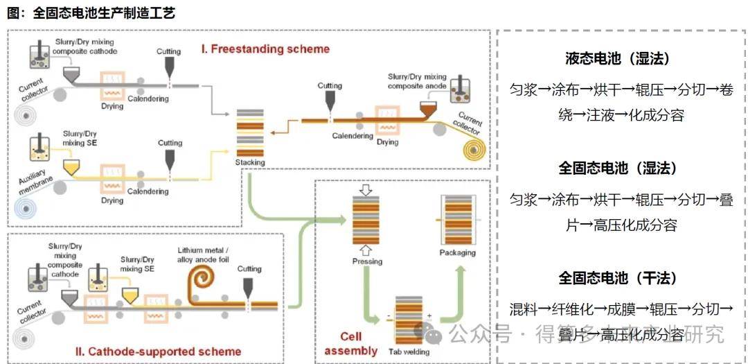 ◆ 固态电解质成膜为制造核心工艺,湿法路线相对成熟,干法路线潜力更大,为未来发展大趋势。全固态电池中,硫化物电解质对极性有机溶剂较为敏感,此外金属锂负极容易与溶剂反应,主流思路为切换干法电极工艺,但目前干法工艺不成熟,难点在于厚度、压实、幅宽、跑速等,主流厂商仍以湿法工艺为主,选取特定溶剂,实现较薄的固态电解质膜厚度,但干法仍为未来发展大趋势。干法电极方面,主要变化在于混料、纤维化和成膜,混料+纤维化相关标的宏工科技,曼恩斯特等,成膜相关标的纳科诺尔、先惠技术、利元亨等。