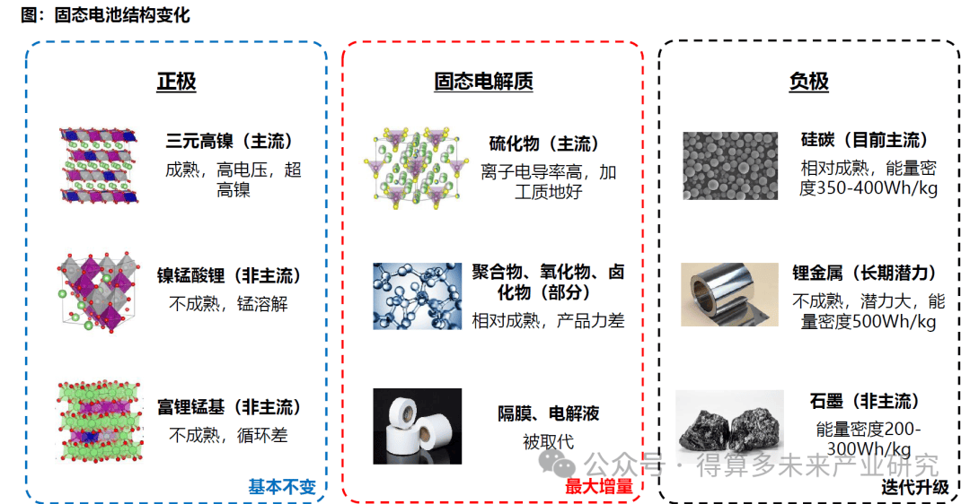 电池中,固态电解质为核心增量,其中硫化物为主流量产路线,主要采用锂磷硫氯材料;正极仍沿用液态电池的三元高
