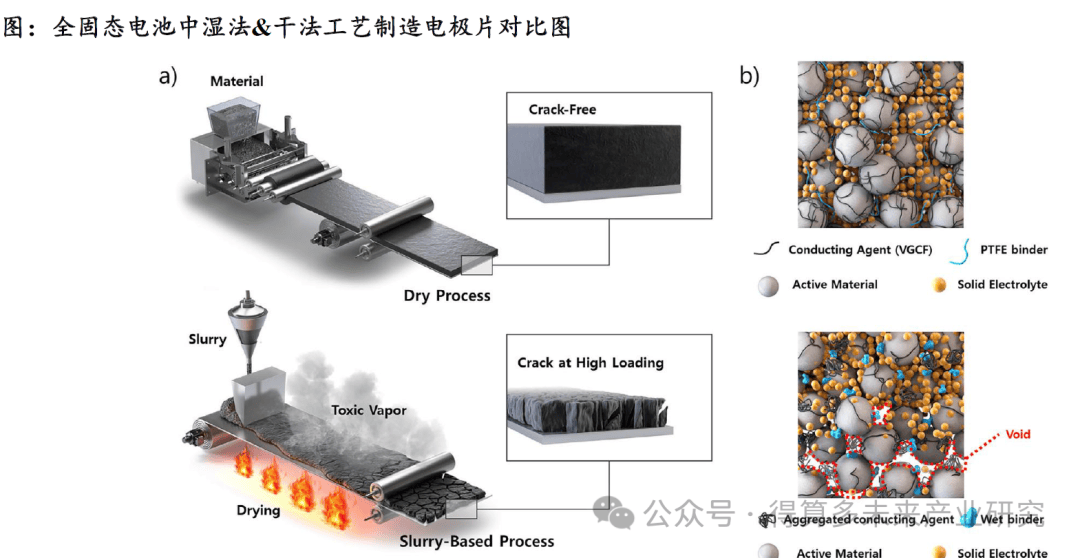 ⚫(1)极片的干法工艺避免了溶剂的使用和干燥环节。①湿法工艺:将活性物质、导电剂、粘结剂分散在液态溶剂中形成浆料,然后将浆料涂布在集流体上,再经过干燥、辊压、蒸发等工序制成电极极片。②干法工艺:不使用液态溶剂,将活性物质、导电剂、粘结剂(通常是PTFE)的干粉混合均匀,然后通过热压延工艺直接压制成连续的电极膜后与集流体复合,或者将干粉混合物直接沉积/压制在集流体上,避免溶剂的使用和干燥过程。