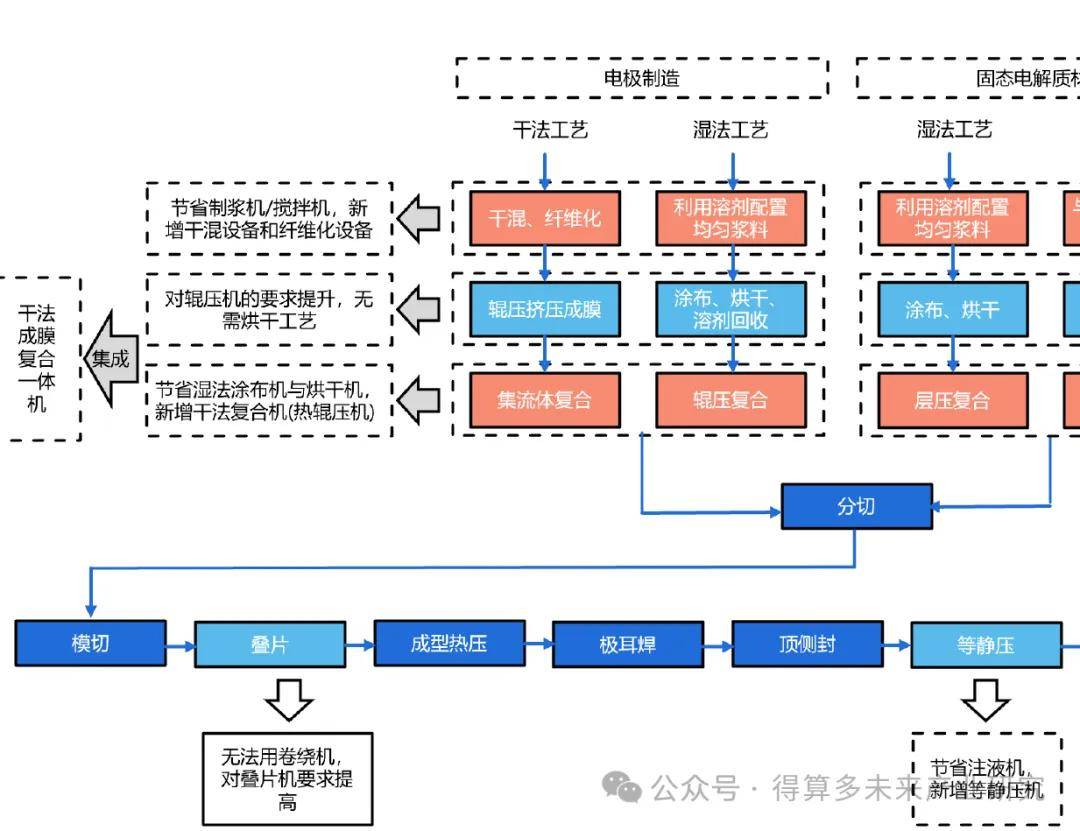 ⚫全固态电池工艺相对液态电池工艺的主要区别在于:(1)前段变化最大,主要在于电解质膜和极片制作工艺上,全固态电池干法工艺增加了干法混合、干法涂布环节实现固态电解质膜制备,不再需要使用溶剂,也不存在烘干环节;全固态电池湿法工艺仍然保留了利用溶剂制备电解质与粘结剂溶液后涂布蒸干制备电解质膜的工序。(2)中段电芯装配环节:全固态电池采用“叠片+极片胶框印刷+等静压技术”取代传统的液态电池卷绕工艺,并删减了注液工序;(3)后段化成分容环节:从液态电池化成分容转向全固态电池所需的高压化成分容。