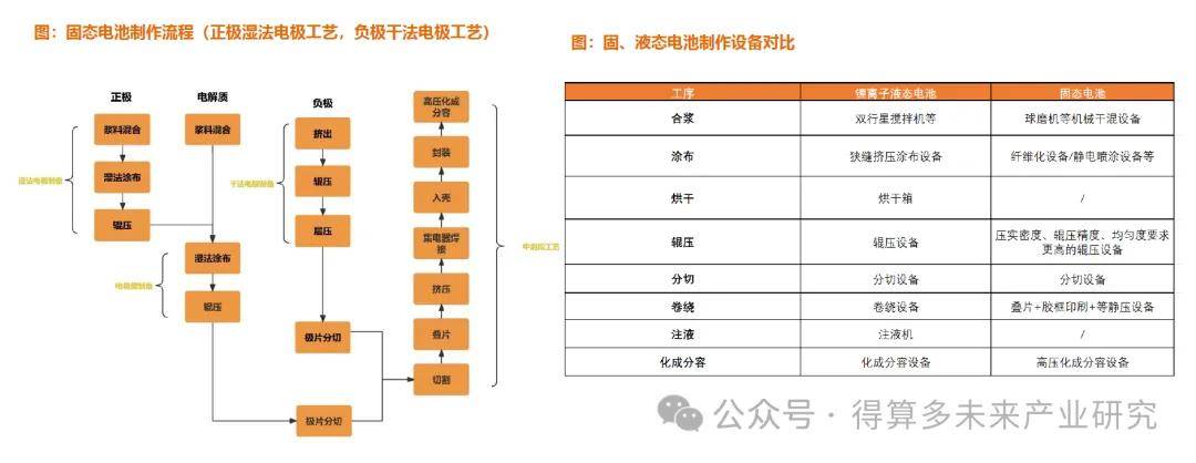 在干法电极以及固态电解质等技术的引入下,固态电池制造设备较传统锂离子液态电池变化较大。11月21日在深圳举办的2024高工锂电年会固态电池论坛上,利元亨固态电池技术总监卢其辉表示,全固态电池制造过程相对液态电池主要区别在于,全固态电池增加了干法混合、干法涂布、无隔膜叠片、高压化成分容等工序,删减了注液部分。根据《Solid-State Battery Roadmap 2035+》报告,固态电池制造设备与目前最先进的锂离子液态电池制造设备相似度仅20%-60%。