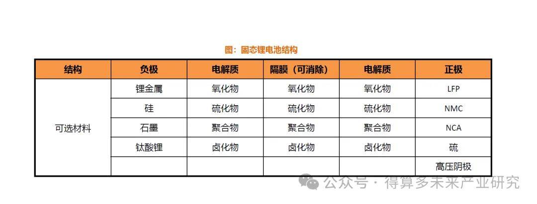 固态电池结构:负极+电解质+隔膜(可消除)+电解质+正极。