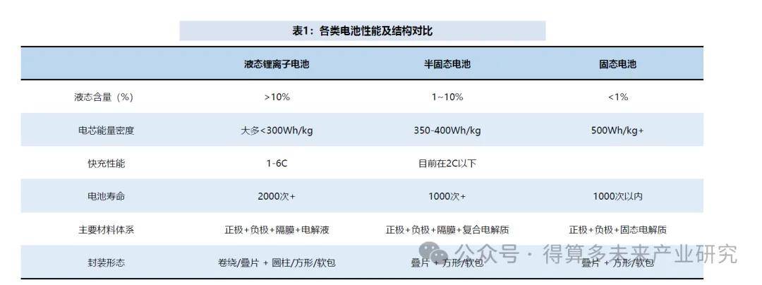 • 根据电解质的不同,锂电池技术体系可分为:液态电解质电池、混合固液电解质电池(半固态电池)、固态电解质电池。