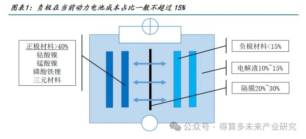 负极材料直接影响电池容量、首效、循环等性能。负极材料系先由负极活性物质、粘合剂和添加剂混合制成糊状均匀涂抹在铜箔两侧,再经干燥、滚压形成。负极材料作为锂电池不可或缺的重要组成部分,直接影响锂电池的容量、首次效率、循环等主要性能,在动力电池成本中占比 一般 不超过 15% 。