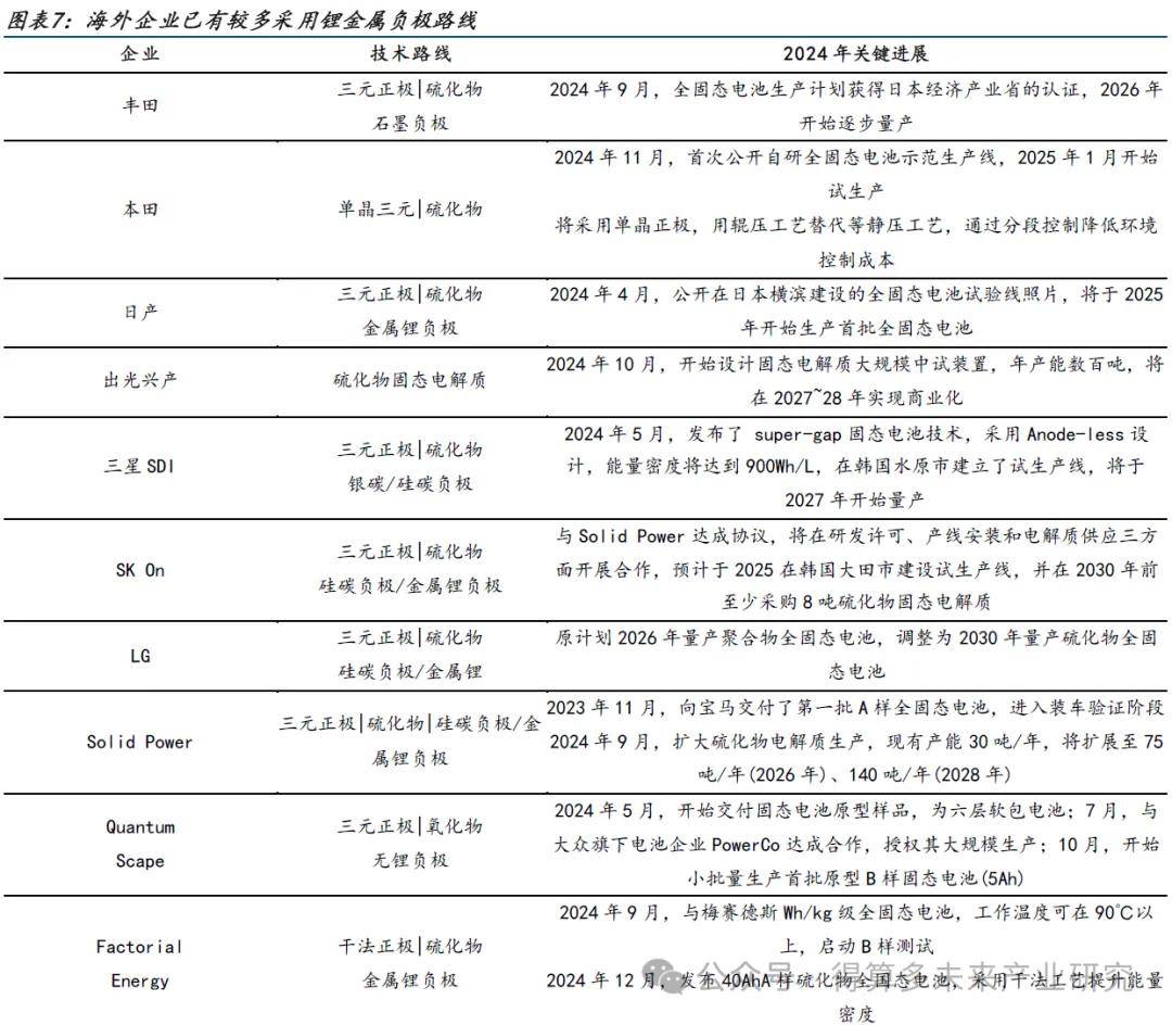 国内固态电池企业负极侧尚以硅碳路线居多 。海外日产、 LG 、 SK On 、 Solid Power 、 Factorial Energy 均采用锂金属负极路线,国内大多数企业仍采用硅碳负极, 宁德时代、 清陶 能源 、 上海屹锂 、恩力动力等采用锂金属负极。