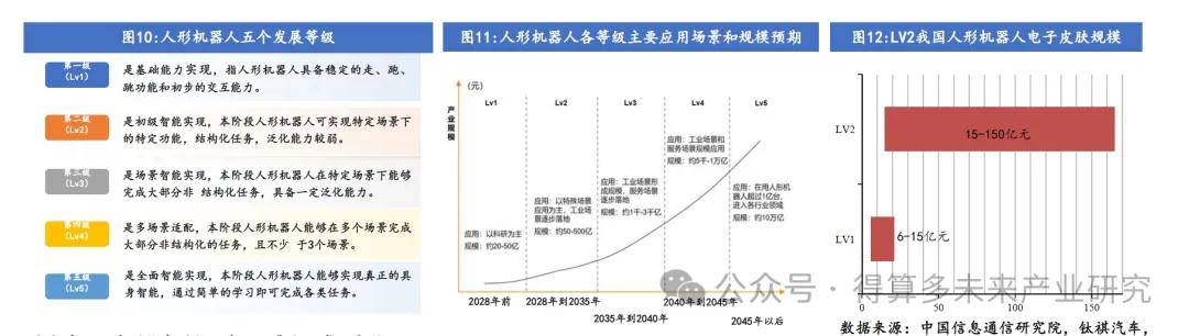ü 目前全球绝大多数全能型人形机器人产品处于Lv1等级,少部分头部企业最新产品和轮式机器人等其他形态的人形机器人正在逐步向Lv2等级探索,并从工业制造领域的to B端向服务领域的to C端拓展。(不同等级市场规模见图11)