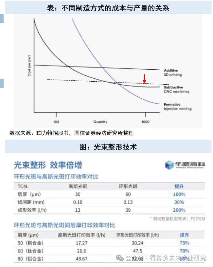 • 3D打印通过增加激光头、增加层厚、改变铺粉方式及嫁接打印等方式提升效率。