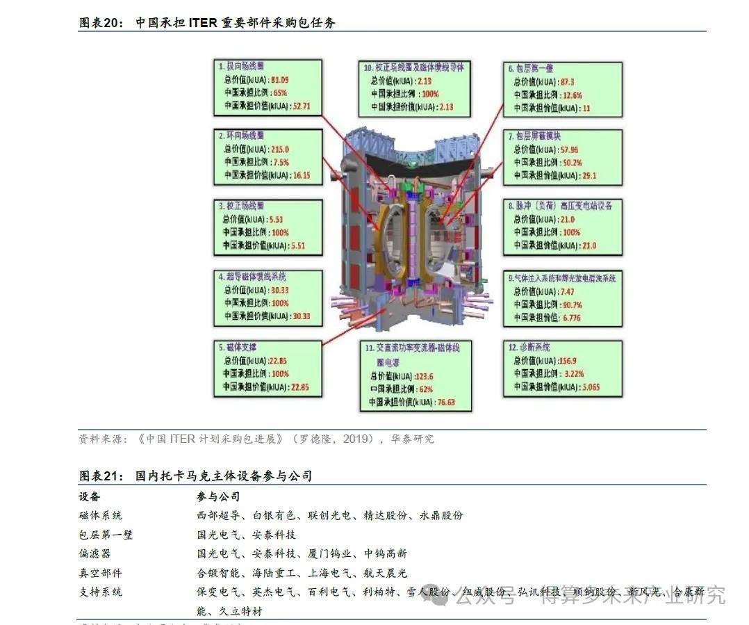 (1)磁体系统:在ITER 项目中,我国负责提供150 吨的NbTi 超导线和30 吨的Nb3Sn超导线,主要供应商包括西部超导、白银有色。此外,高温超导材料是未来托卡马克的发展方向,研制公司有联创光电、精达股份、永鼎股份等。