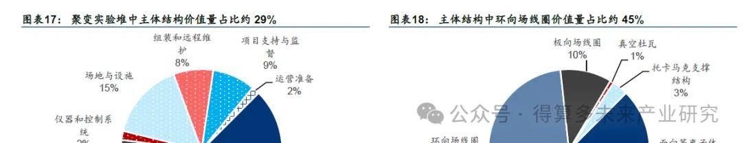 托卡马克聚变实验堆中主机价值量占比近半,主体结构中环向场线圈/面向等离子体部件/真空室及内部件价值量占比靠前。根据美国的聚变点火研究实验(FIRE),托卡马克聚变实验堆建设成本约为12 亿美元,其中主机包括主体结构(包括磁体系统、真空室及内部件等)和辅助系统(包括气体注入系统、真空系统、燃料循环系统、加热系统等),分别占比约29%和15%,电力系统占比约18%,场地与设施占比约15%,其他包括诊断、控制系统等占比约23%。在主体结构中,磁场线圈占比(包括极向场与环向场线圈)最高为55%,其次为面向等离子体部件(包括第一壁、偏滤器等)和真空部件(包括真空室及内部件与真空杜瓦),分别占比约27%和15%。