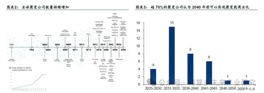 核聚变私营公司蓬勃发展,多数公司预计2031-2040 年可实现聚变商业化。自2017 年开始,聚变行业景气度持续上升,核聚变私营公司不断涌现。根据Fusion Industry Association,截至2024Q4,商业核聚变公司共有46 家,其中美国有25 家,占比一半以上。在预计可控核聚变何时能够低成本和高效率的用于商业化的调查问卷中,超过70%的受访公司认为在2031-2040 年能够实现商业化应用,核聚变私营公司对于可控核聚变的商业化应用预期乐观。