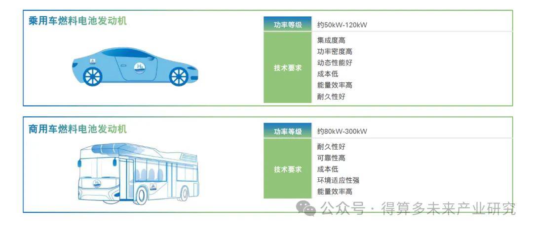 按照应⽤场景的不同,燃料电池发动机可分为乘⽤车燃料电池发动机、商⽤车燃料电池发动机、⾮道路车辆燃料电池发动机、船⽤燃料电池发动机、机车燃料电池发动机,以及燃料电池航空发动机等。⽬前乘⽤车和商⽤车是燃料电池发动机的主要应⽤场景。