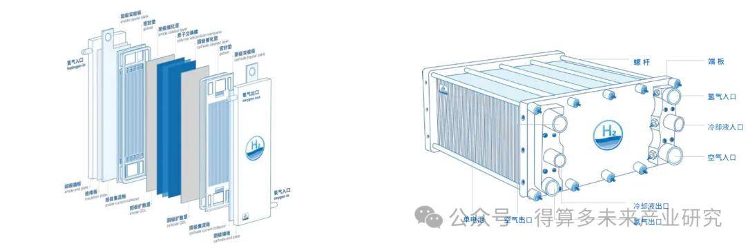 电堆结构为双极板和膜电极的交替叠合,并各单体之间嵌⼊密封件,经前、后端板压紧后⽤螺杆或钢带紧固拴牢。