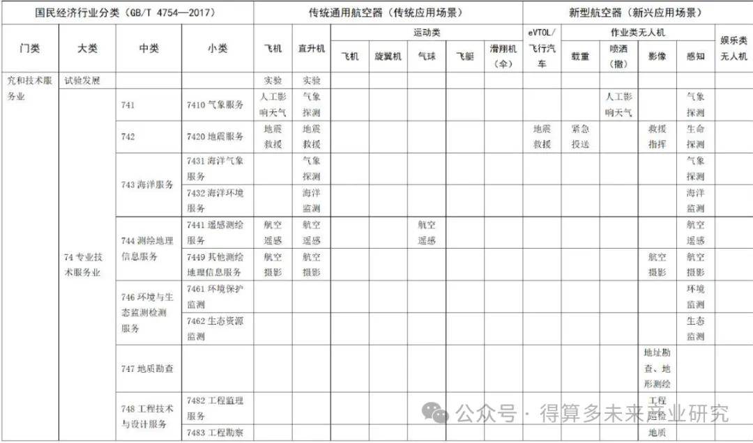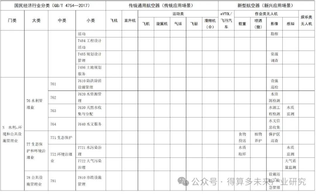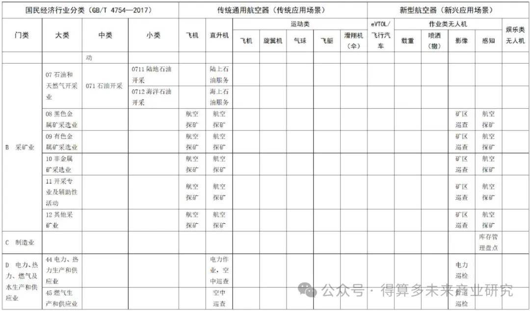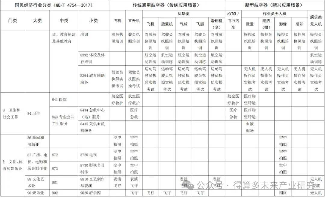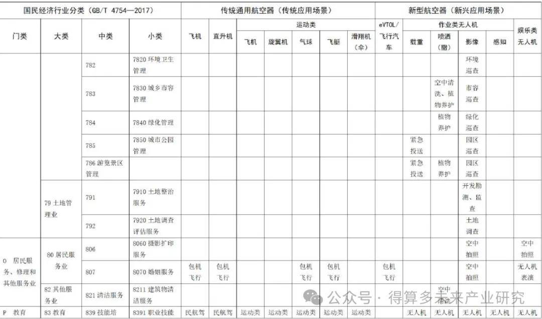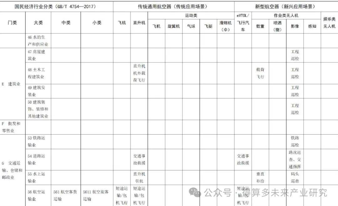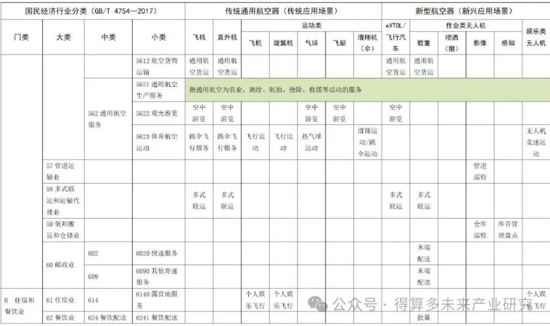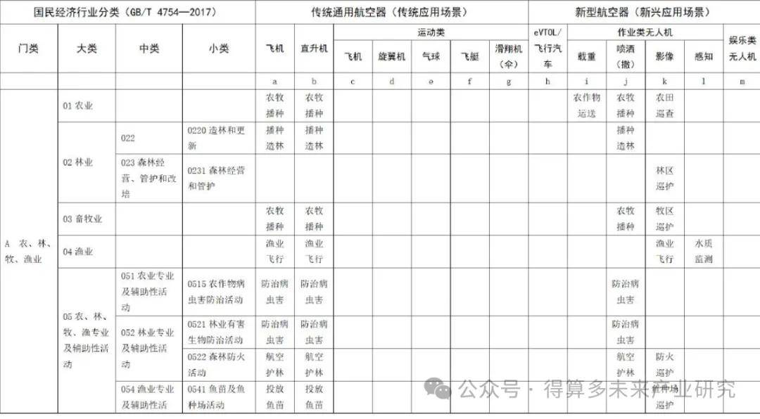 纵轴:低空服务应用体系(需求侧)。按照《国民经济行业分类(GB/T4754-2017)》中的门类、大类、中类和小类四级详细展开,包括国民经济行业的全部20个门类,涉及低空服务场景的47个大类、51个中类和64个小类共99个细分领域(行),代码沿用(GB/T4754)文件。