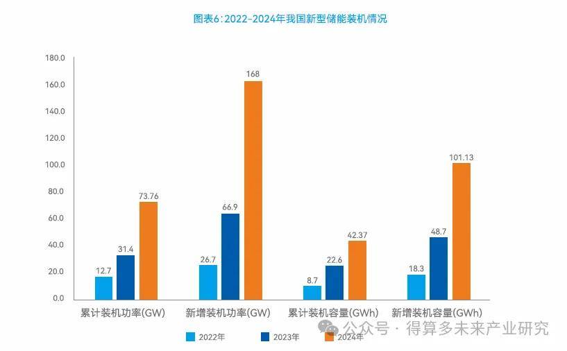 在政策、技术、成本多因素作用下,2024年我国新型储能装机量翻倍增长。2024年,我国新型储能装机规模突破7000万千瓦。截至2024年底,全国已建成投运新型储能项目累计装机规模达73.76GW/168GWh,约为“十三五"末的20倍,较2023年底增长超130%。