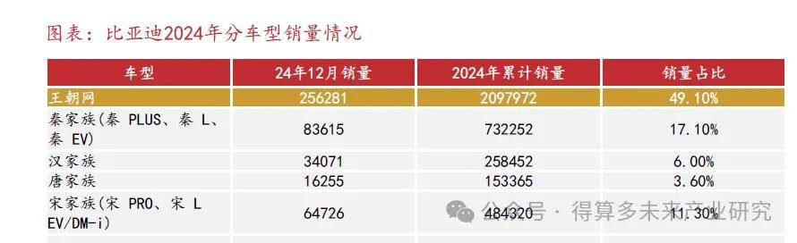 比亚迪在2024年实现销量领先,全年总销量达到427.2万辆。根据比亚迪股份有限公司数据,比亚迪2024年销售了427万辆,其中包括425万辆乘用车,同比增长41.1%。其中,乘用车的海外销量为417204辆,同比增长71.9%。比亚迪继续蝉联中国汽车市场的销量冠军,并稳居全球新能源车市场的销量第一。从各个产品系列来看,王朝系列(如秦、汉等)2024年销量达到了209.8万辆,海洋系列(包括宋PLUS、海豹、海狮等)销量为192.9万辆,方程豹和腾势的销量分别为5.6万辆和12.6万辆。2025年一月份销量比去年同期上涨将近50%,达到30万辆,持续实现高增长。