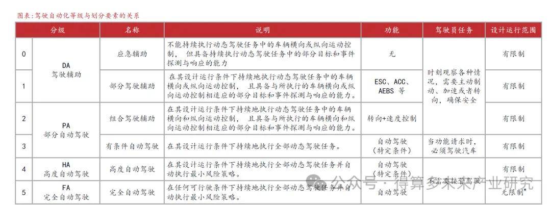 自动驾驶技术的分级通常采用0到5级的标准。从0级到5级,代表着从应急辅助到完全自动驾驶的不同能力。随着等级的提升,自动驾驶系统的功能逐渐增强,车辆能够在更多情况下自主执行驾驶任务,减少对驾驶员的干预的需要。0级和1级主要是对驾驶员的辅助,而2级到4级则逐步实现更高程度的自动化,最终达到5级完全自动驾驶,车辆在任何情况下都能独立完成驾驶任务。自动驾驶能力的提升不仅意味着驾驶员的操作减少,同时驾驶的安全性也会有所提高。