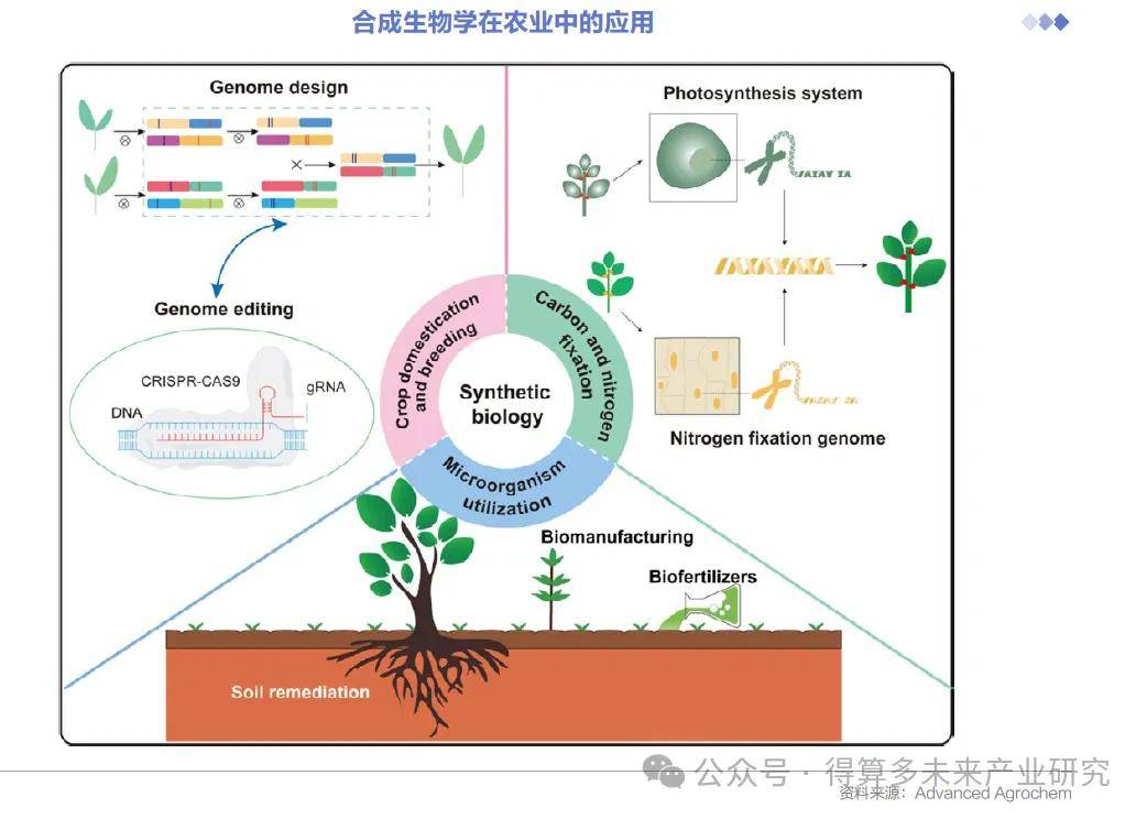 光合作用与固氮作用。作为微生物肥料的固氮微生物,是合成生物学目前在农业中较为关注的应用场景。Pivot Bio公司开发了第一种基于γ-变形杆菌(KV137)的玉米生物肥料—该细菌作用于玉米根部,让微生物可以从空气中转化氮元素满足作物日常氮需求。拜耳作物科学与Ginkgo Bioworks联手成立子公司Joyn Bio,专注于工程固氮微生物,能够让种植者减少30-40%的肥料投入。国内的绿氮生物也在发力可持续生物氮肥。此外,合成生物学在环境修复中的应用潜力较大。合成微生物群落通过重塑土壤微生物群落结构,为利用微生物修复土壤、提高微生物存活率提供了解决方案,这是未来的一个应用方向。农药生物制造。目前一些新兴的合成生物学公司,利用细菌、酵母等生物体进行原料的加工和合成,致力于开发天然农药。这种绿色生产技术可以改变农药等农用化学品的生产方式,还可以减少工业过程中对于能源和资源的消耗,并减少空气、水和土壤的污染和生产成本。如Oxitec公司研发基因改造昆虫控制疾病或作物害虫的传播。AgriMetis公司开发天然产物衍生的化合物来保护作物免受杂草、真菌病和害虫的侵害。实现生物制造农药的绿色生产,还有着很大的发展空间。
