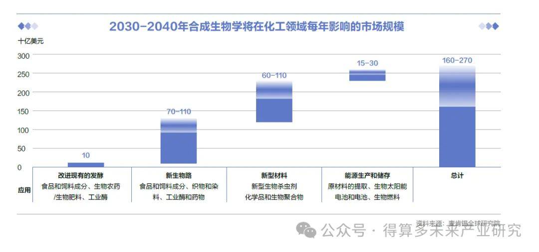 化工领域中合成生物学发展迅速,生物路线逐步实现对传统化学路线的替代。据麦肯锡预测,未来10-20年,合成生物学预计将每年对化工能源等领域的1600-2700亿美元市场产生直接经济影响,约占合成生物学总影响的8%。合成生物学在化工领域的应用主要包含材料和化学品、化工用酶、生物燃料等方向。