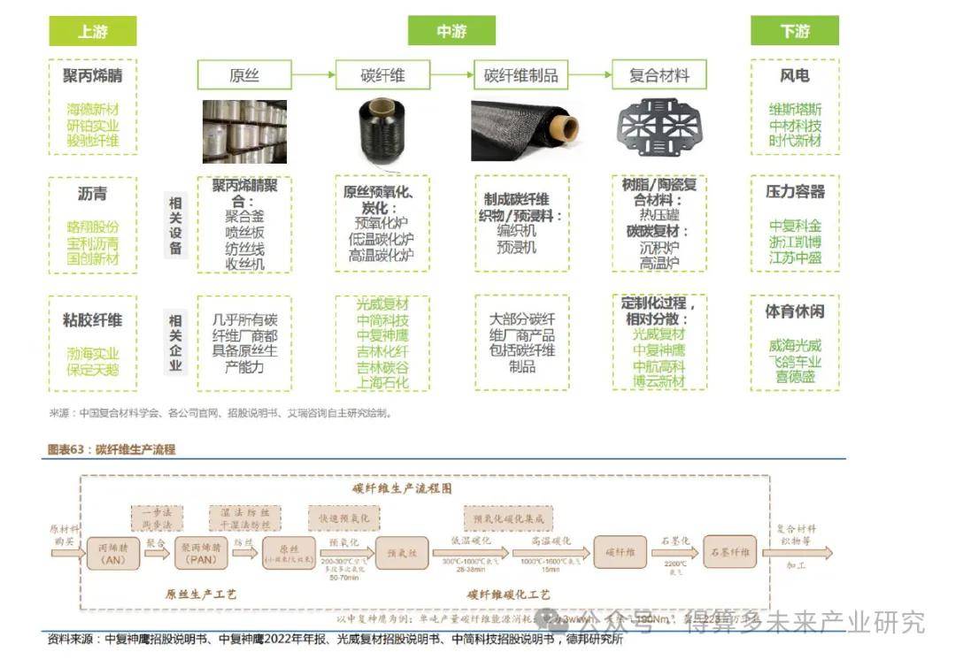 碳纤维的产业链包含从一次能源到终端应用的完整制造过程,一般分为原丝制备和碳丝制备两个阶段,一般公司也会按照生产环节将生产车间分为原丝车间、碳丝车间。其中原丝制备主要包括聚合、纺丝工段,碳丝制备主要包括预氧化、碳化工段。制成碳纤维后,为进一步提升弹性模量,还可石墨化为石墨纤维。
