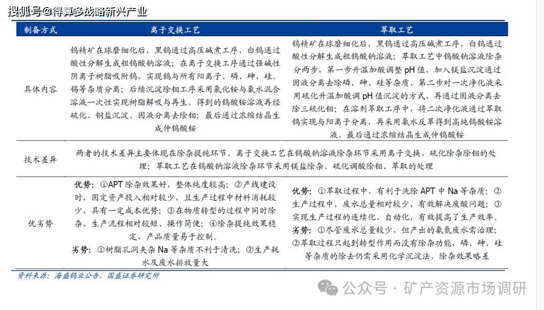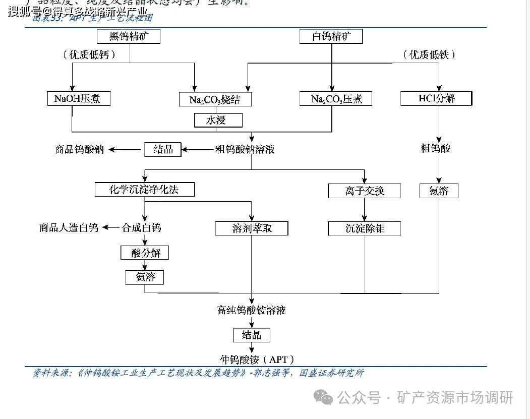 仲钨酸铵:即APT(Ammonium Paratungstate),化学式为(NH₄)WO·xH₂O,是钨冶炼的中间产物,在整个钨产业链中具有承前启后的重要作用。中国APT 冶炼技术早期从前苏联引入,主要采用苏打烧结工艺处理黑钨精矿。随着国内黑钨资源相对贫化、矿石成分趋于复杂及环保驱动下,主流APT生产工艺逐步演进为:烧碱((黑钨)/苏打((白钨)压煮制得粗钨酸钠——离子交换法/溶剂萃取法转型为APT 溶液+钨钼分离——结晶得到APT,从而将含65%WO3 的钨精矿转化为含88.5%WO3 的APT,实现钨元素的富集。