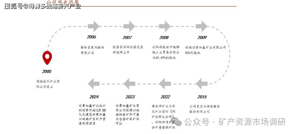 公司前身是湖南省湘西金矿,2000年12月,经湖南省人民政府批准,改制成立湖南辰州矿业有限责任公司,2006年6月整体变更为湖南辰州矿业股份有限公司,2007年8月在深圳证券交易所上市。此后公司加快了兼并收购的速度:2008年收购湖南省中南锑钨工业贸易有限公司49.49%的股权,2009年收购甘肃加鑫矿业有限公司90%的股权,2012年公司以“股权+债权”方式投资鑫矿矿业。2015年5月,公司更名为湖南黄金股份有限公司。2022年2月公司全资子公司黄金洞矿业与巨龙矿业签订《探矿权转让合同》,收购巨龙矿业拥有的湖南省平江县曲溪矿区金矿普查探矿权,2022年6月公司发布公告,新龙矿业拥有的龙山金锑矿采矿许可证短期延续办理完成,2023年11月,公司子公司甘肃加鑫矿业有限公司获得甘肃省自然资源厅颁发的以地南铜金矿和下看木仓金矿采矿许可证,2024年5月,公司控股子公司甘肃加鑫矿业拟计划投资不超过5.88亿元建设甘肃加鑫以地南矿区矿产资源利用项目。