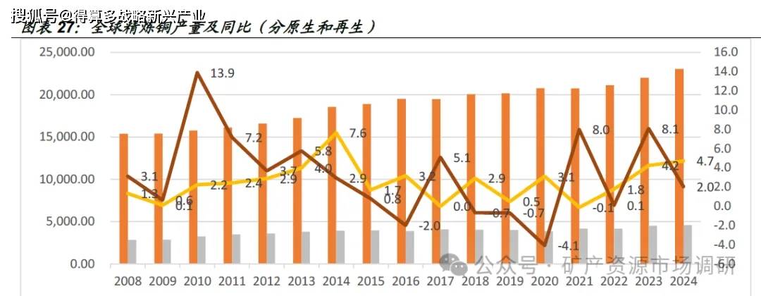 ⚫ 全球2024 年产量为2763.4 万吨,同比增长4.3%,其中原生精炼铜(电解和电积)2305.2万吨,同比增速4.7%,再生精炼铜产量458.1万吨,同比增速2.1%。