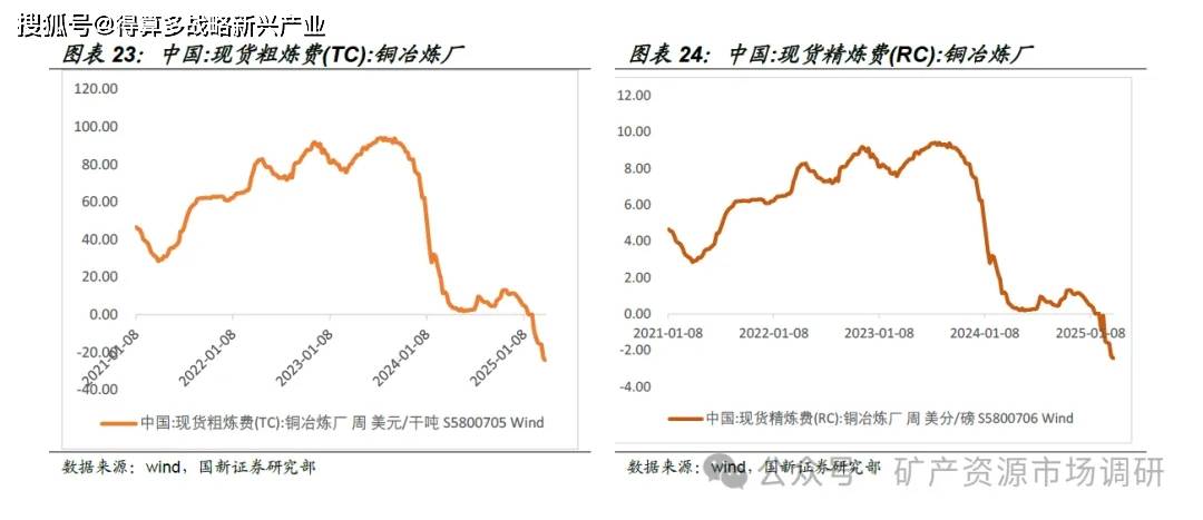 ⚫ 2025 年长单TC/RC 基准价:根据国际铜研究组织(ICSGICSG)与智利安托法加斯塔公司协议的数据显示,2025 年长单加工费定为21.25 美元 吨(2.125 美分 磅),较2024 年基准价(80 美元 吨)下降73.4% 。