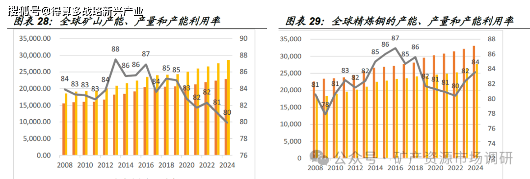 ⚫ 铜矿矿山限制:2024年全球矿山产能2863万吨,产量2288.4万吨,产能利用率79.9%,延续下降。