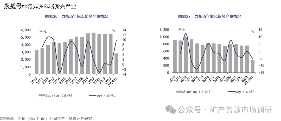 2023年力拓总计产铝土矿5461.9万吨,同比+0.00%,产氧化铝753.7万吨,同比-0.09%。2024H1力拓铝土矿产量为2810万吨,同比+9.77%,氧化铝产量为350万吨,同比-5.41%。