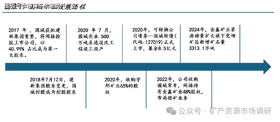 公司前身为建新矿业,2009 年建新集团收购上市公司 28.87% 的股份,成为公司实控人;2013 年注入矿山资源(东升庙矿业); 2016 年 10 月 ,由于 建新矿业控股股东建新集团因无法清偿到期债务,申请破产重组 ;此后国城控股被确定为重整方,取得建新集团 100% 股权,直接和间接合计持有上市公司 73.98% 的股份,成为实控人,上市公司自此更名为国城矿业(股票代码: 000688.SZ )。