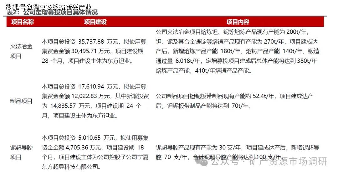 定增募投项目稳步推进,产能释放有望助力业绩快速增长。公司为了解决现有生产线产能不足、个别设备老化、生产效率不高等问题,同时也是为了聚焦高端化发展,开展定增项目对火法冶金、制品产线以及铌超导腔产能进行扩充,并对制品产线进行智能化升级改造。2024H1,公司定增项目按计划稳步推进,公司超导腔、板带材技术改造项目设备、产线调试和试生产运行已基本完成,火法项目大部分设备已完成安装调试并进入满负荷生产状态。展望2025 年,公司产能接近翻倍增长,熔炼产品产能将达到380t/年,熔铸产品产能将达到410t/年,钽铌板带制品产能将达到 70t/年,超导腔产能将达到100 支/年,伴随公司定增项目扩充产能逐步释放,公司业绩有望快速增长。