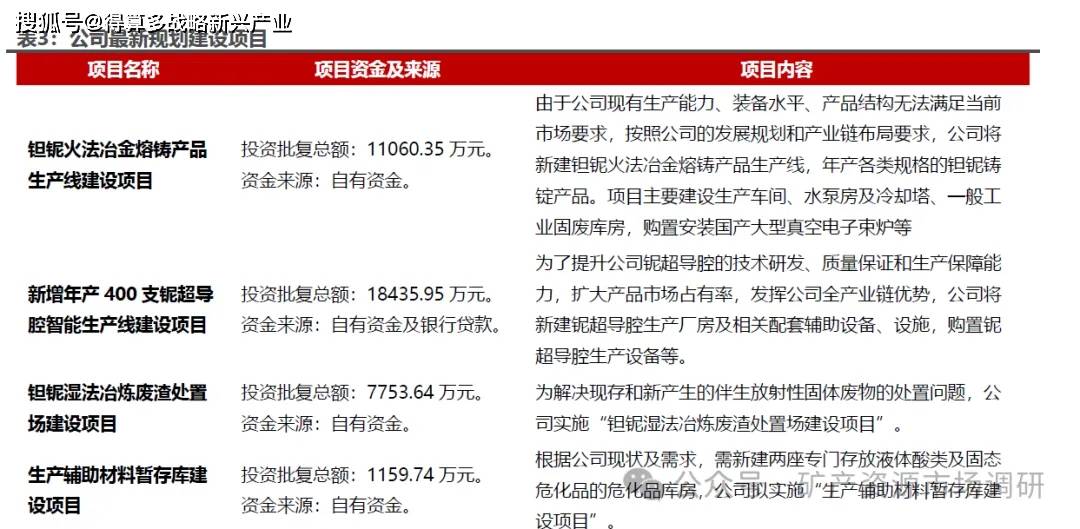 响应下游旺盛需求,公司利用自有资金追加项目建设实现产能扩充。由于公司下游需求十分迫切,公司现有生产能力、装备水平、产品结构无法满足当前市场要求,公司计划利用自有资金追加项目建设。钽铌火法冶金熔铸产品生产线将新建钽铌火法冶金熔铸产品生产线进一步完善火法产能,新增年产400支铌超导腔智能生产线建设项目将使得整体射频超导腔产能达到500支,钽铌湿法冶炼废渣处置场建设项目将帮助公司解决产能规模扩张之后面临的伴生放射性固体废物的处置问题。综合前期定增募投项目叠加自有资金建设项目,公司产能规模将得到大幅提升,钽铌行业龙头地位进一步稳固。