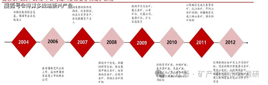 “资源整合-技术深耕-全球扩张”,公司从地方国企成长为国际化黄金公司分为三个关键阶段:阶段一:资源整合后进入快速扩张期(2004-2012 年)。2004 年由招金集团联合复星、豫园等企业发起设立招金矿业,2006 年在香港联交所主板上市,成为国内首家港股上市的黄金企业。公司通过集团资产注入(如夏甸、大尹格庄等核心矿山)和外延并购(如新疆、甘肃等地项目),矿产金产量从2007 年的8.4 吨增至2012 年的18.1 吨。