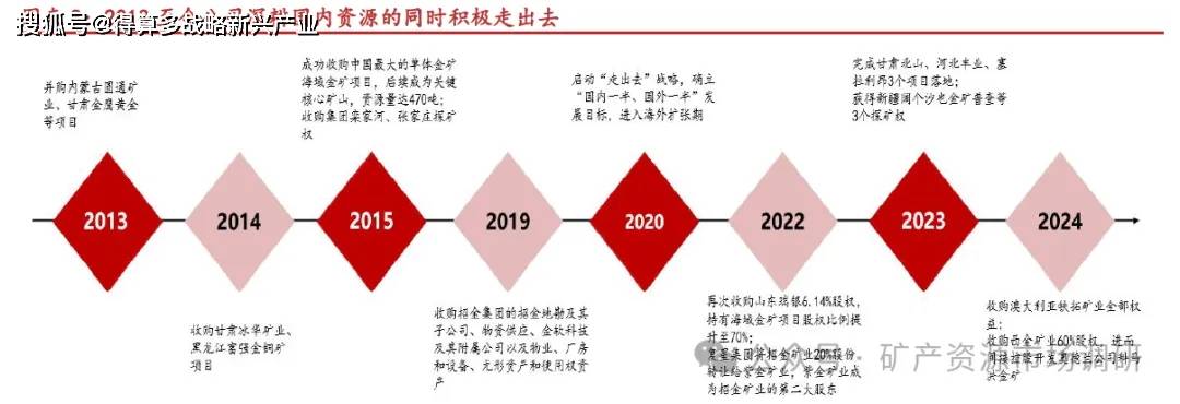 阶段二:深耕国内资源,建成三大产金基地(2013-2019 年)。受金价下行及山东省矿山安全整治影响,公司转向稳产增效,收购海域金矿(2015 年)成为关键布局,为公司实现新增金资源量470 吨。期间公司建成了山东、甘肃、新疆三大产金基地,在全国范围内遍布34 家矿山,实现了“埠内一半、埠外一半”的阶段性目标。