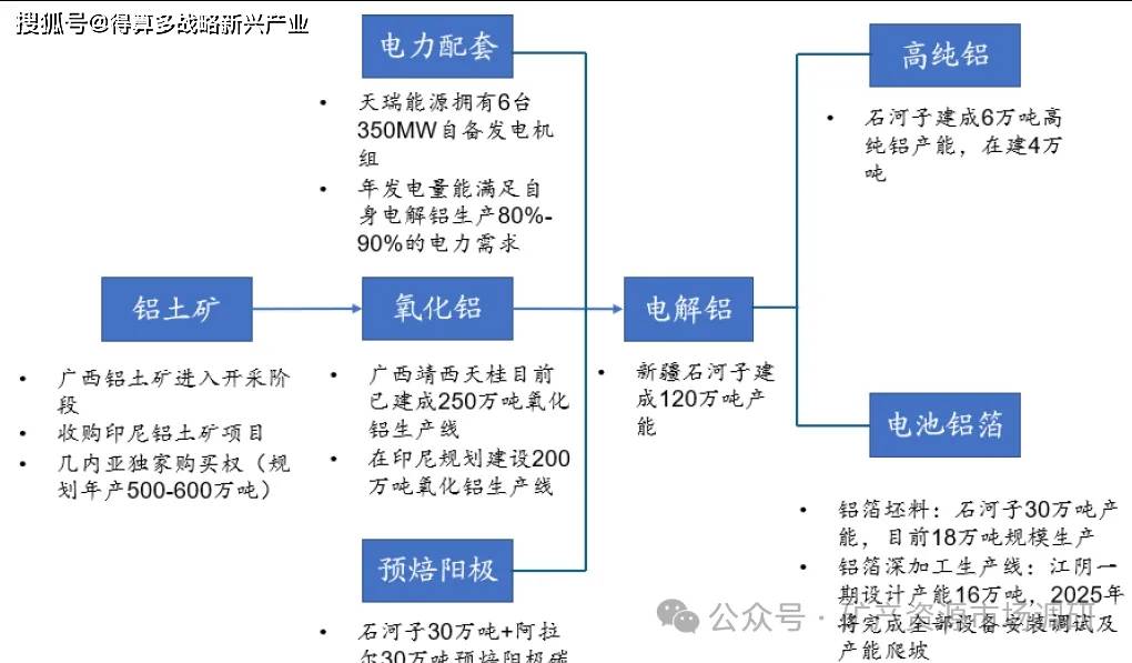 天山铝业成立于2010年,在新疆石河子现有120万吨电解铝产能,同时公司已经涵盖上游铝土矿(印度尼西亚、几内亚)、氧化铝(广西、印度尼西亚),配套的预焙阳极、发电以及下游的电池铝箔、高纯铝、铝深加工业务,是国内少数具备完整一体化铝产业链优势的综合性铝生产、制造和销售的大型企业之一。