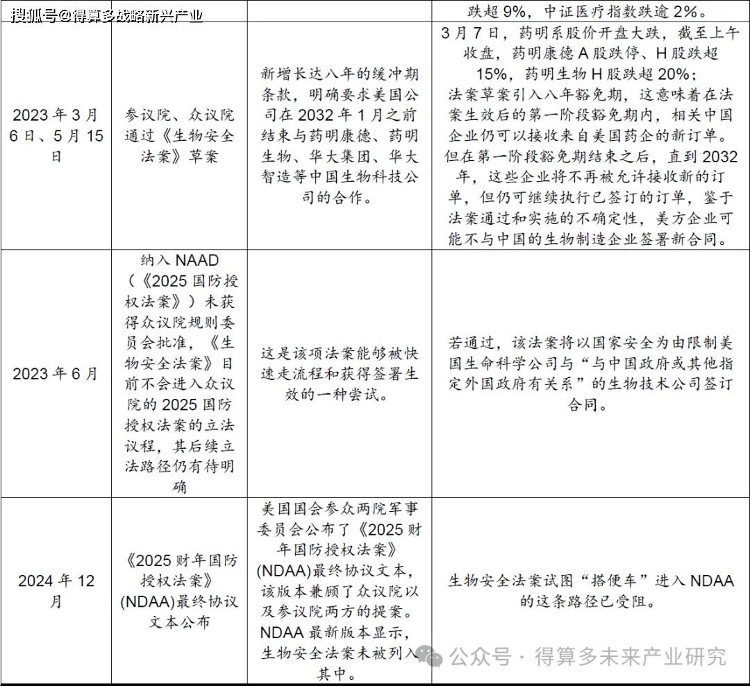 另一方面,海外政策也影响着全球生物制造市场,直接或间接地影响国内合成生物学企业下游需求。美国《生物安全法》以美国国家安全为由,企图以立法手段干预正常市场秩序,限制中国生物制造企业出口,从而扩大美国本土公司在基因测序领域的垄断态势。截至2024年12月7日,美国参众两院推动《生物安全法案》进入2025财年NDAA以期尽快完成立法程序的意图受阻,但法案是否会落地、以何种形式对合成生物学企业产生影响,仍具有不确定性。基于市场对美国生物医药行业或将减少对中国供应链依赖的恐慌,这项法案自诞生以来已数次导致国内CRO板块股价异动。此种妨碍公平竞争的法律法规将促使中国政府加速国内生物制造市场拓展、配合供给端国产替代,进一步完成合成生物学产业完整、健康的价值循环。