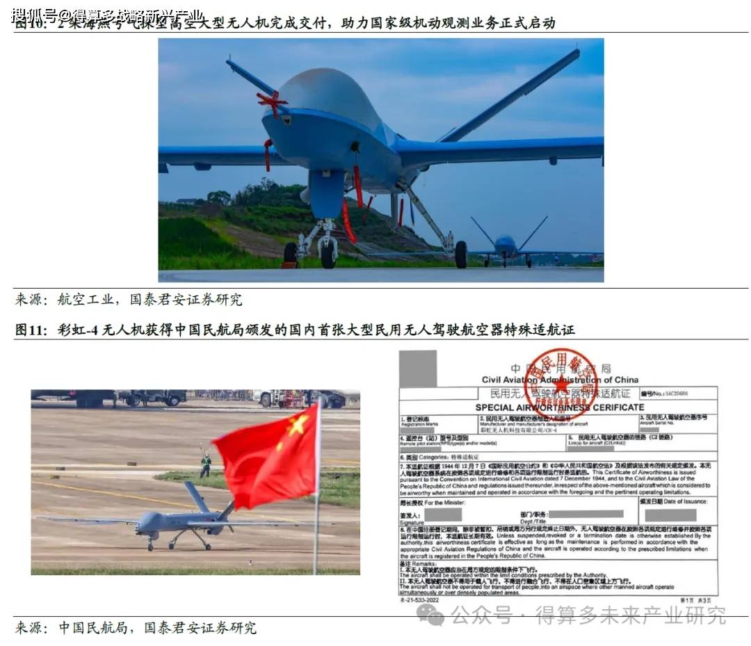 在目前民用工业无人机领域,除了大疆创新、纵横股份、极飞科技等传统的工业无人机厂商,政策红利释放刚性需求、军用技术民用化降本增效、多元化战略对冲军贸风险等也促使诸多军用无人机企业也开始发力民用领域。如中无人机围绕我国气象探测需求研制“海燕”气探系列无人机(翼龙-2、翼龙-10),面对我国应急通信需求,在应急管理部牵引下成功研制翼龙-2 应急型。航天彩虹的彩虹-4 无人机于2024 年11 月获得中国民航局颁发的国内首张大型民用无人驾驶航空器特殊适航证,申请大型民用无人机标准适航证的相关取证工作也已经有条不紊地开展。基于彩虹系列无人机平台,航天彩虹多年来在我国民用领域,特别是自然资源部8 家应急测绘单位、大兴安岭林业集团加格达奇航空护林站森林防火以及航空物探、应急通信、海洋监测、人工增雨等领域不断开拓创新填补业界空白,并开展常态化的飞行作业。