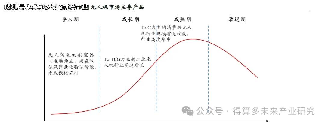载人运输类无人机行业尚在导入期,消费级无人机行业逐渐步入成熟期,只有工业无人机行业正处于高速扩张的成长期。目前载人类无人驾驶的航空器(电动为主)尚在取证及商业化验证阶段,未规模化应用;而从各机构的规模统计及预测上看,近年来To C 为主的消费级无人机的规模增速和市场占比远不及To B/G 端的工业无人机。据Frost & Sullivan 预测,从2019 年到2024 年,全球消费级无人机市场规模增长仅2 倍,但工业级无人机市场规模能够翻10 倍。实际数据显示,自2021 年起,工业无人机的市场占比开始超过消费无人机,根据赛迪顾问出具的报告,2023 年中国工业级无人机产业规模占民用无人机市场的65.3%,未来工业无人机将成为民用无人机市场主导产品。另外,可以看到的是,消费无人机行业高度集中,大疆一家占据全球70%以上市场份额,在国内市占率更高;而工业无人机的下游应用场景广阔、标准化程度不高,因此,除大疆、纵横股份、极飞科技、亿嘉和等头部企业外,众多中小型无人机企业亦可凭借产品定制化特点和商业渠道完成市场布局,目前国内工业无人机厂商超过一万家。