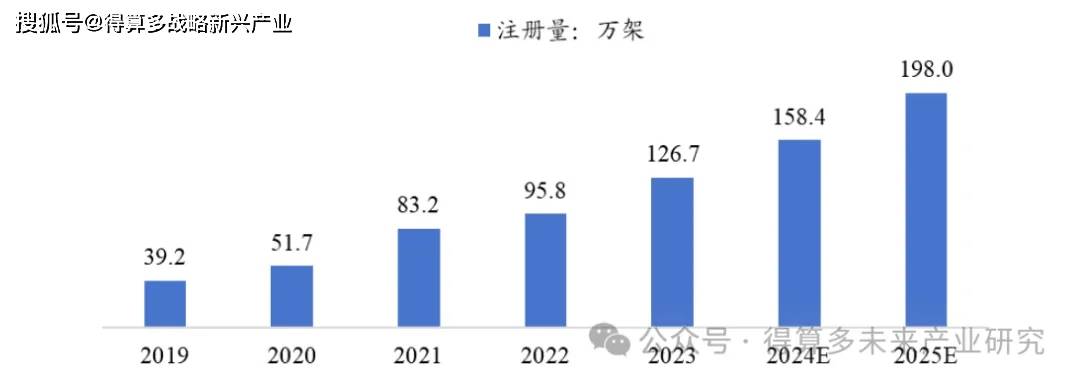 在全球无人机行业的发展过程中,虽然国内起步较晚,但已经实现了“弯道超车”,尤其在民用无人机市场,截至2023 年6 月底,我国无人驾驶航空器销量占据了全球约70%的市场份额。几组数据看,根据中商产业研究院统计,2023 年中国民用无人机市场规模达1174.3 亿元,同比增长32%;2023 年末全行业注册无人机共126.7 万架,同比增长32%;中国无人机运营企业数量19825 家,同比增长31%。