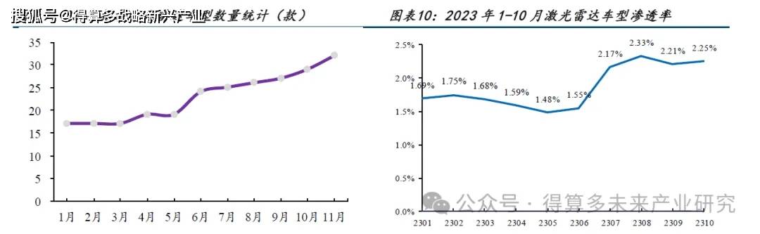 根据GGAI 的统计, 2023 年 1 9 月市场上共有 13 个品牌 29 款车型搭载了数量不等的激光雷达,其中搭载一颗激光雷达为市场主流。我们测算 Q3 激光雷达渗透率快速提升, 8 月最高达 2.33%2.33%,预计 24Q1 激光雷达 单月渗透率将突破 4% 。
