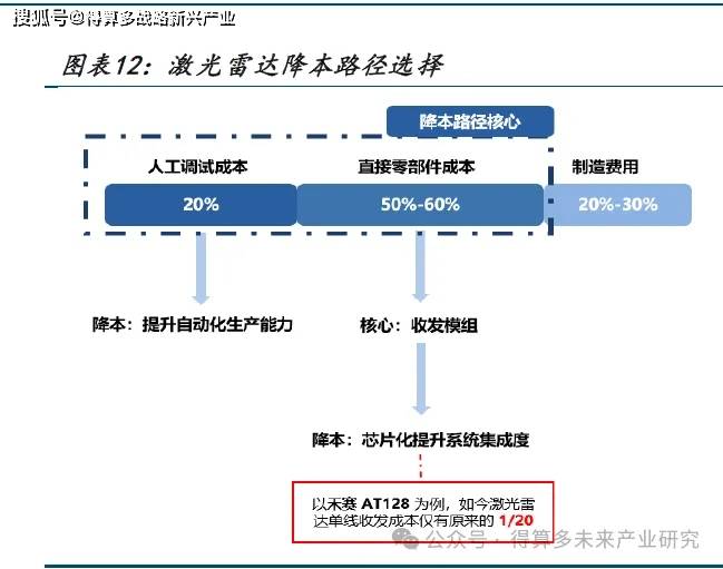 3、激光雷达降本超预期,巩固应用地位 。长期以来,阻碍激光雷达应用的是其高昂的 BOM 成本。首先通过 对收发部件芯片化设计提高系统集成度,如禾赛量产的 AT128 ,如今的激光雷达单线收发成本仅有原来分立式系统的 1/20 。