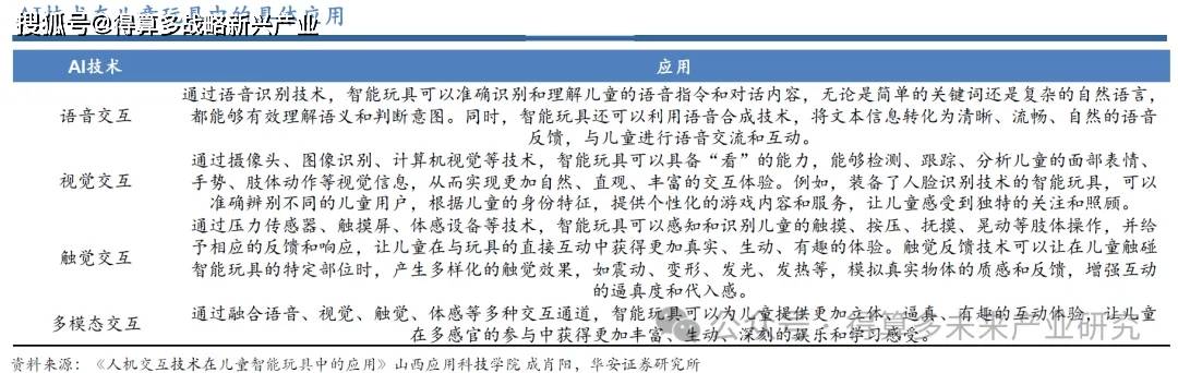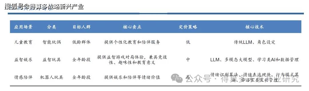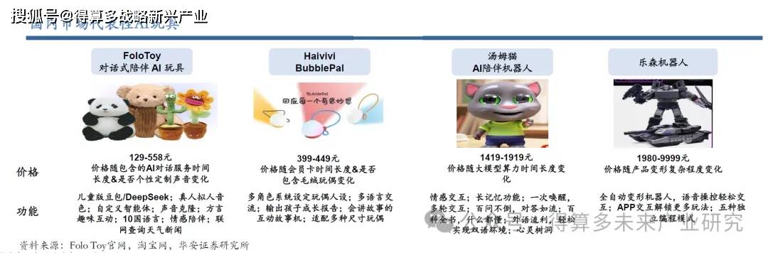 第三,AI玩具潜在应用场景多元,能满足不同类型的目标用户需求。(1)儿童教育:原本功能有限的早教玩具仅能讲故事和播放儿歌等,而借助 AI 技术后,能够讲述定制化的故事、回答儿童的疑问、参与猜词游戏、接龙游戏、模拟家庭生活等,同时具备长期的仿生记忆功能,使其能够在与儿童的互动中不断学习和适应,以提供更加个性化的陪伴体验。(2)情感陪伴:普通玩偶在 AI 的赋能下,能像真实动物/伙伴那样表达情感,依据所处环境与主人交流互动,展现出独有的个性以及多样的情绪波动,进阶为更高级的情感伴侣。(3)益智娱乐:在普通益智玩具基础上引入AI人机对战模式,使用深度智能算法,可以为益智玩具提供更加有趣、具有启发性、互动性的娱乐体验。