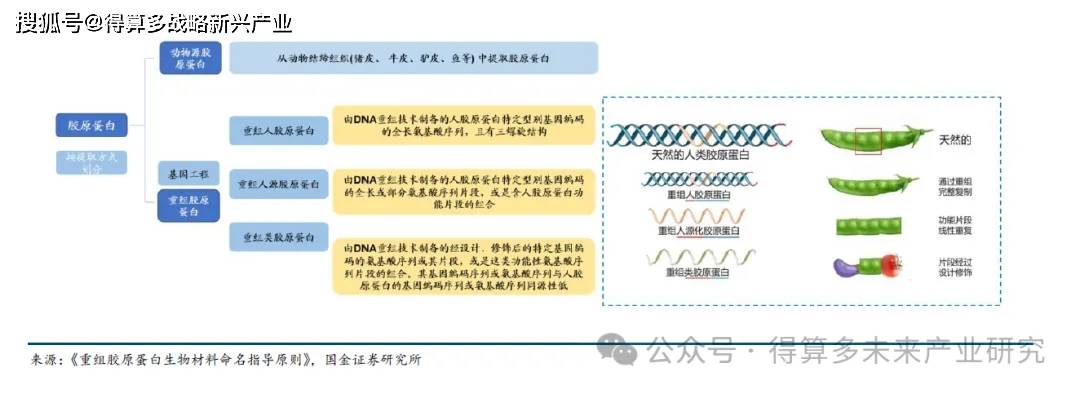 重组胶原蛋白由基因工程合成按照与天然人胶原蛋白相似程度,重组胶原蛋白可进一步分为重组人胶原蛋白、重组人源胶原蛋白、重组类胶原蛋白 。 1 )重组人源胶原蛋白 由DNA 重组技术制备的人胶原蛋白特定型别基因编码的全长或部分氨基酸序列片段,或是含人胶原蛋白功能片段的组合 2 )重组人胶原蛋白 由 DNA 重组技术制备的人胶原蛋白特定型别基因编码的全长氨基酸序列 ,且有三螺旋结构 。
