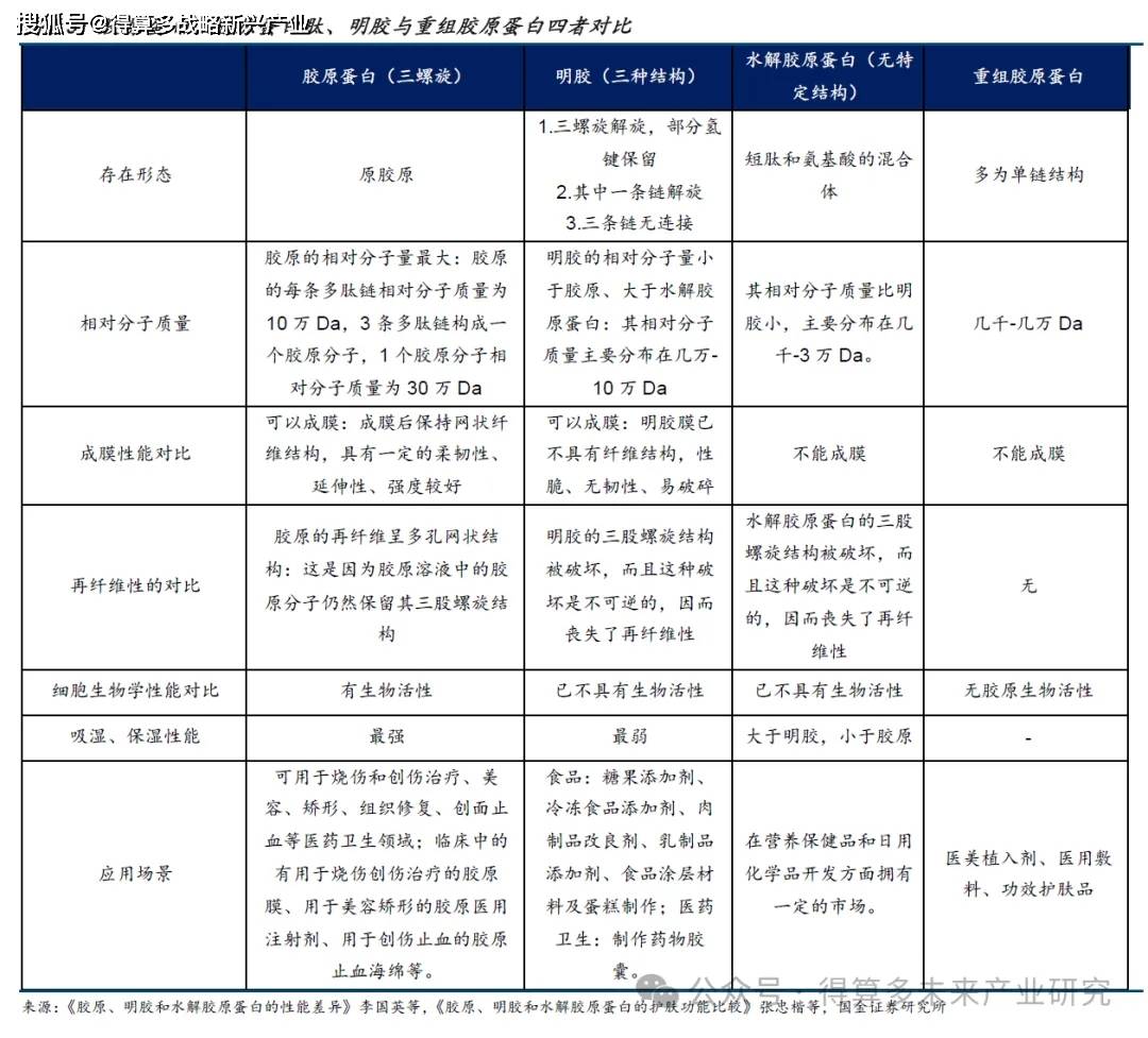 对比重组胶原蛋白、动物源胶原蛋白、透明质酸,重组胶原蛋白处于快速发展期,随着技术不断进步、有望进一步打开下游各领域应用空间,目前实现护肤、医美水光产品规模化生产,未来向填充、组织工程的修复再生材料突破;动物源胶原蛋白护肤 医用辅料、医美等应用成熟,受限产能 病原体残留风险,发展相对平稳;透明质酸 发展 最为成熟,终端产品应用范围不断突破扩大 。