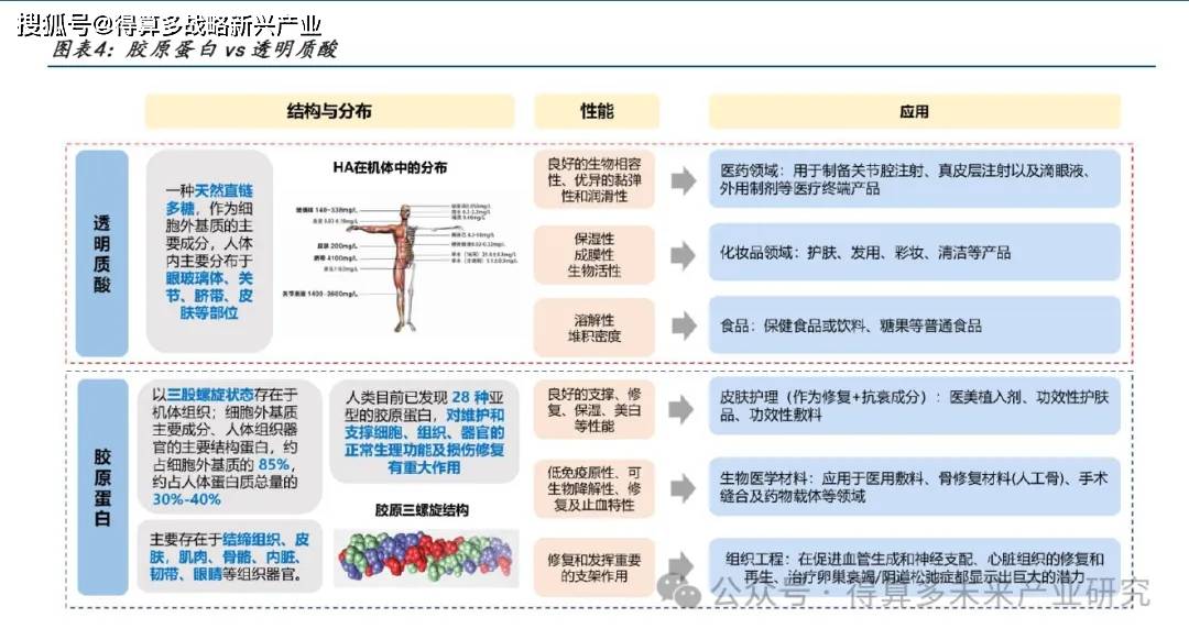 胶原蛋白结构更复杂多样、 分布更广 ,对维护和支撑细胞、组织、器官的正常生理功能及损伤修复有重大作用,在皮肤护理、生物医学材料、组织工程领域应用前景广阔 。 1 结构:胶原蛋白以三股螺旋状态存在于机体组织 透明质酸是一种天然直链多糖 ,对比来看胶原蛋白结构更为复杂和多样 2 分布: 胶原蛋白与 透明质酸均为细胞外基质的主要成分,其中胶原蛋白约占细胞外基质的 85%85%,同时胶原蛋白也是人体组织器官的主要结构蛋白; 3 )性能:胶原蛋白与 透明质酸均具有良好的生物降解性及生物相容性,胶原蛋白发挥支撑、修复和再生各种组织和器官的作用, 透明质酸 侧重保水性、润滑性、黏弹性 。