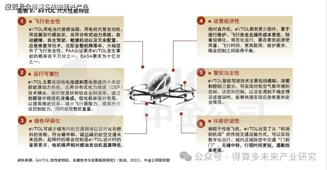 eVTOL可满足轻量化交通出行eVTOL具备 安全 /可靠 /环保 /经济 /智能 /舒适 等特征,可满足轻量化空中交通出行 。 eVTOL是指以电力作为飞行动力来源 的垂直起降飞行器, 相对传统飞行器 具有 安全性、可靠性、环保性、经济性、智能性、舒适性等六大性能 特征 可使人或货物以无缝、经济的方式在城市低空快速流动,高效开发城市低空空域资源,以有效 缓解 日益严重的城市地面交通拥堵问题 并解决空中物资运输和交通出行的需求。