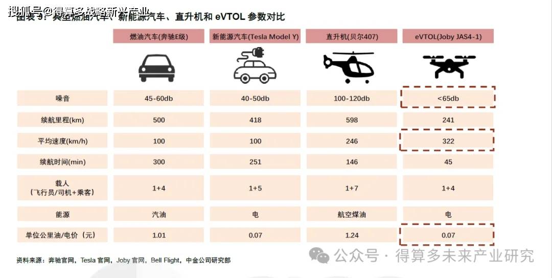 eVTOL具有 噪音低、速度快、低 运营 成本等优势。 我们 以 Joby JAS4-1为例, 与燃油汽车(奔驰 E级)、新能源汽车( Tesla Model Y)和直升机(贝尔 407)各参数进行 对比 1 eVTOL在噪音方面相比直升机具有明显优势; 2 Joby JAS4-1巡航速度可达322km/h,相比传统的交通方式速度更快,可实现短时间城内、城际交通出行 3 eVTOL采用电力作为主要动力方式, 我们测算 单公里所需电力成本不足 0.1元, 相较 汽油或者航空煤油作为主要动力的交通工具运营成本更低,且绿色环保, 符合碳中和、碳达峰的航空交通未来趋势 。